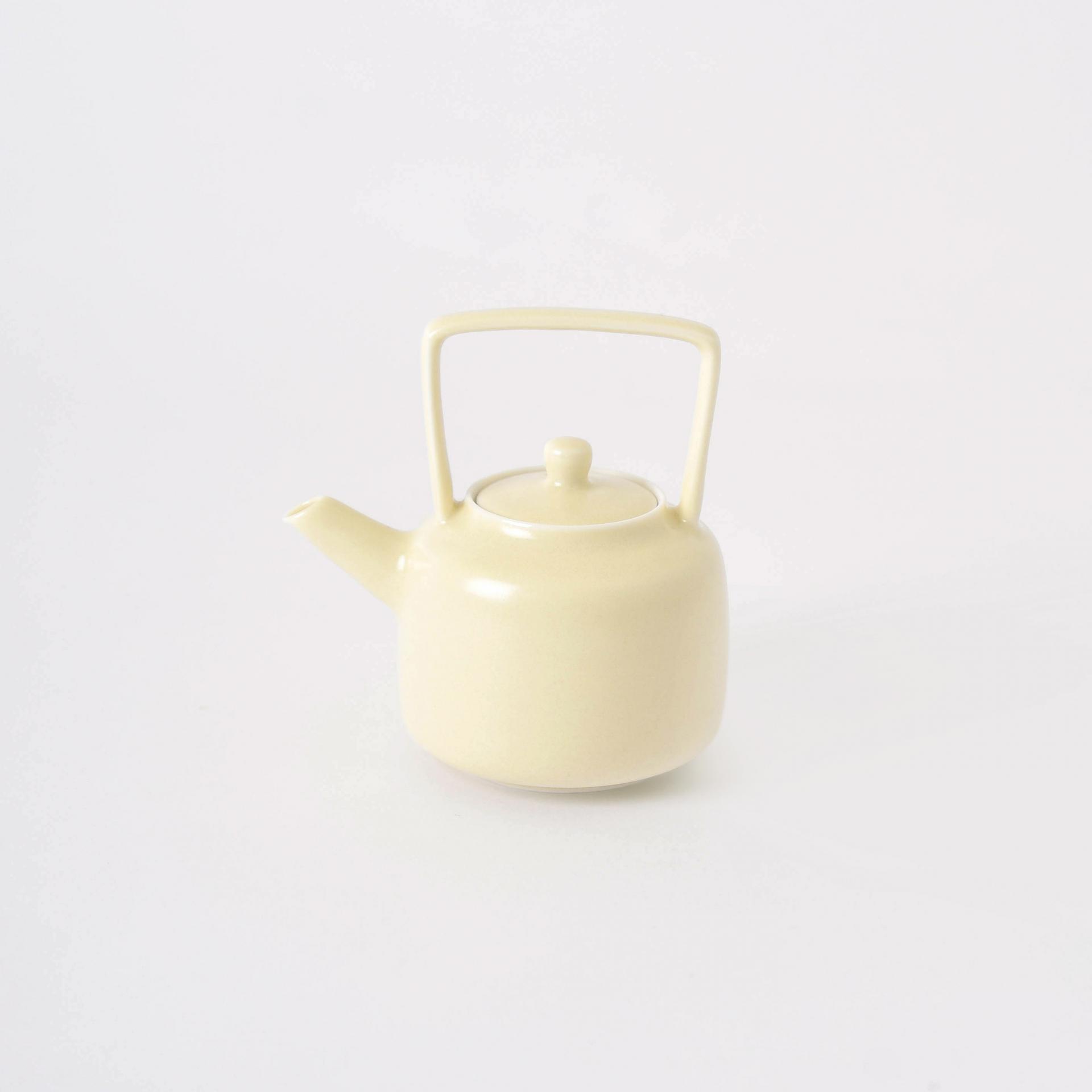 부드러운 노란빛의 각이 진 손잡이가 있는 상파 다관입니다.